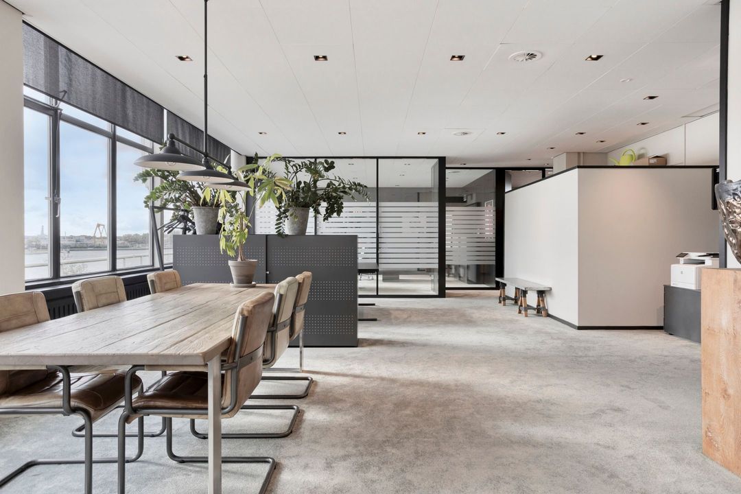 Aan de Westerkade 7 E, gelegen in het monumentale Scheepvaartkwartier, bevindt zich deze hoogwaardige kantoorruimte van circa 194 m² met een spectaculair uitzicht over de Maas en de skyline van Rotterdam. De ruimte bevindt zich op de bovenste verdieping van een karakteristiek pand en wordt niet voor niets aangeduid als een ‘Pentoffice’ — een zeldzame combinatie van representativiteit, comfort en uitzicht.