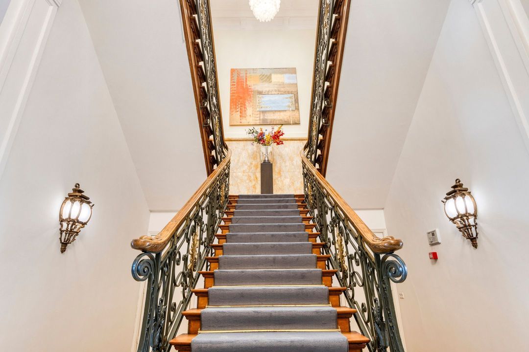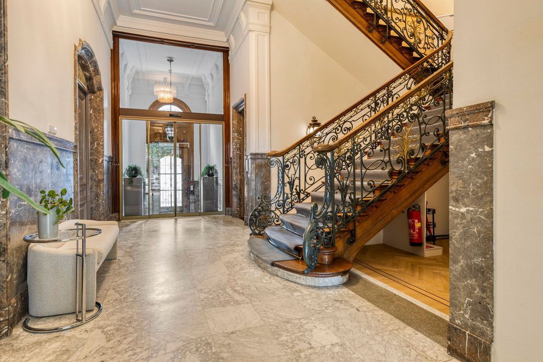 Het pand heeft een klassieke uitstraling met een souterrain, twee verdiepingen en een kapverdieping onder een leien schilddak. De rijk gedecoreerde gevel is opgetrokken in rode baksteen met natuurstenen details. De entree, bereikbaar via een bordestrap, wordt geaccentueerd door gietijzeren lantaarns, een sierlijke deurpartij en een erker met koperen koepeldak.
